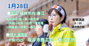 今日は朝夕2回街頭に立ちました! のど飴を差し入れてくださる方、写真を撮ろうと言ってくださる方、感謝です。 夕方は、永平寺町議の酒井和美先生と自民党福井市支部副支部長の清水れいこさんも駆けつけてくれました。 母として、福 […]